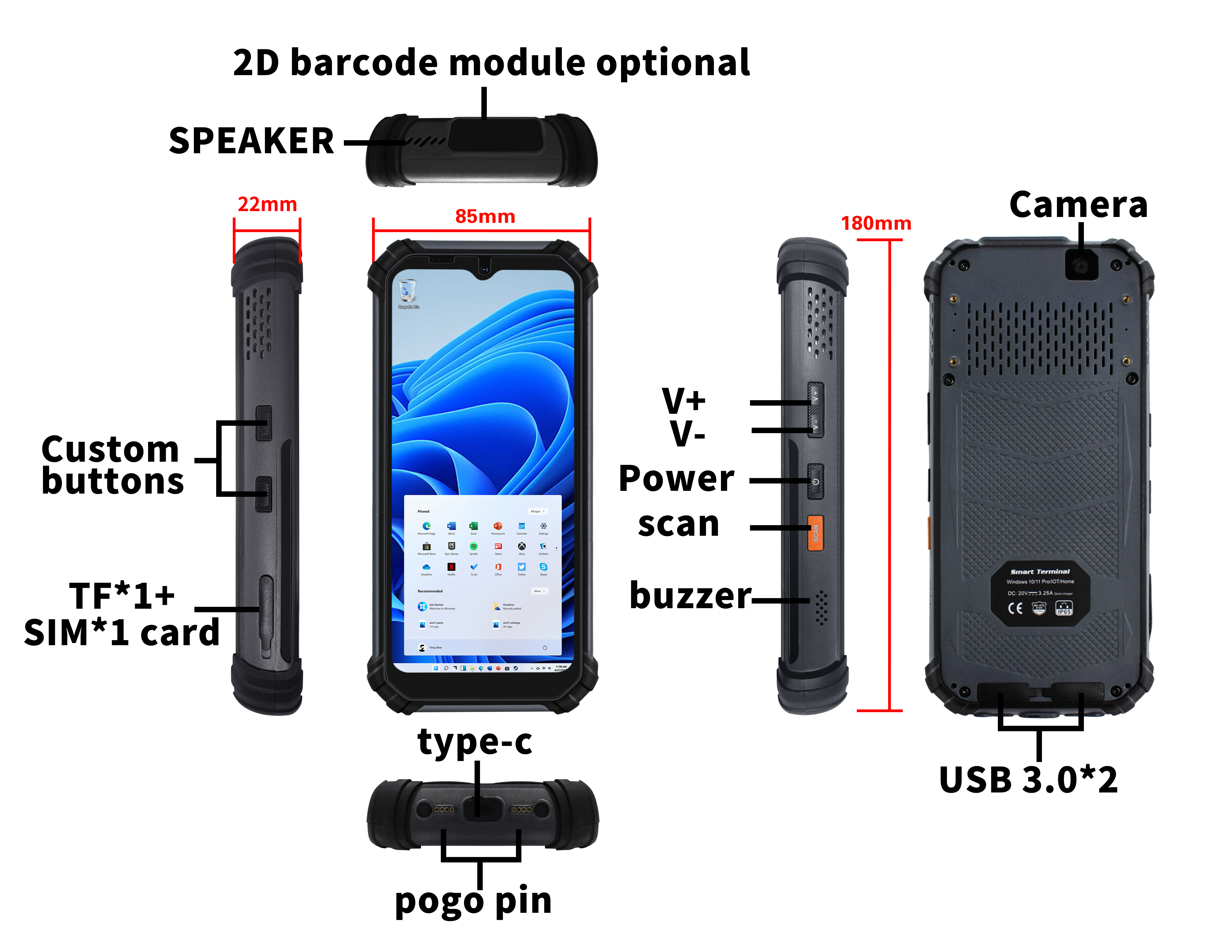 Terminal portable Windows 11 robuste pour un usage industriel.Processeur Intel N100, écran de 6,5 pouces, batterie longue de 5000mAh. Intégration de la numérisation 2D, NFC, protection Beidou / GPS.IP65, résistance aux chutes de 1,2 m, fonctionnement -20 ° C ~ 55 ° C. Connectivité complète, compatibilité avec les logiciels industriels, extension flexible.Idéal pour la logistique, l'entreposage et les opérations sur le terrain.