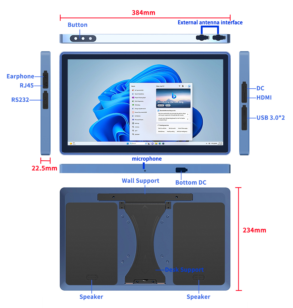 Double interface d'alimentation DC 12V 3A ∮4,0mm ×2 ; HDMI Type A ×1 ; USB Type-A 3.2 Gen1 ×2 USB Type-C 3.2 Gen1 ×1 (charge PD, affichage DP, transfert de données, recharge) ; Jack casque ∮3,5mm ×1 Ethernet Gigabit (RJ45) ; RS232 (connecteur DB9 standard) |