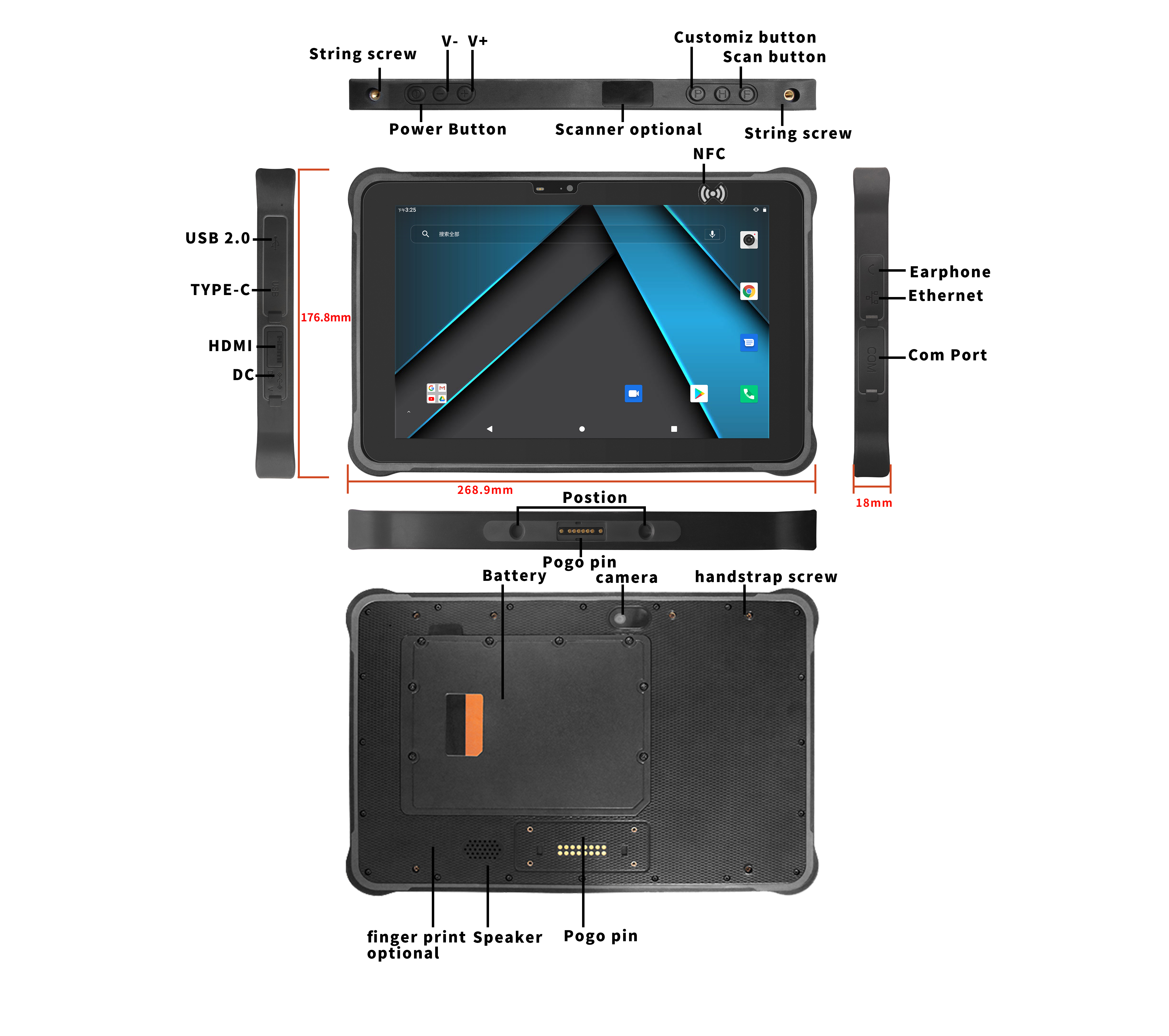Type-C ×1 (OTG), Slot pour carte SIM×1, Slot pour carte TF×1, Jack casque×1, DC×1 (3,5×12 mm), USB 2.0 ×1, RJ45×1, RS232×1, HDMI×1 (Uniquement version 8+256) Pogopin inférieur : USB 2.0 ; Charge ; RS232 Pogopin arrière : USB 2.0 ; RS232 |