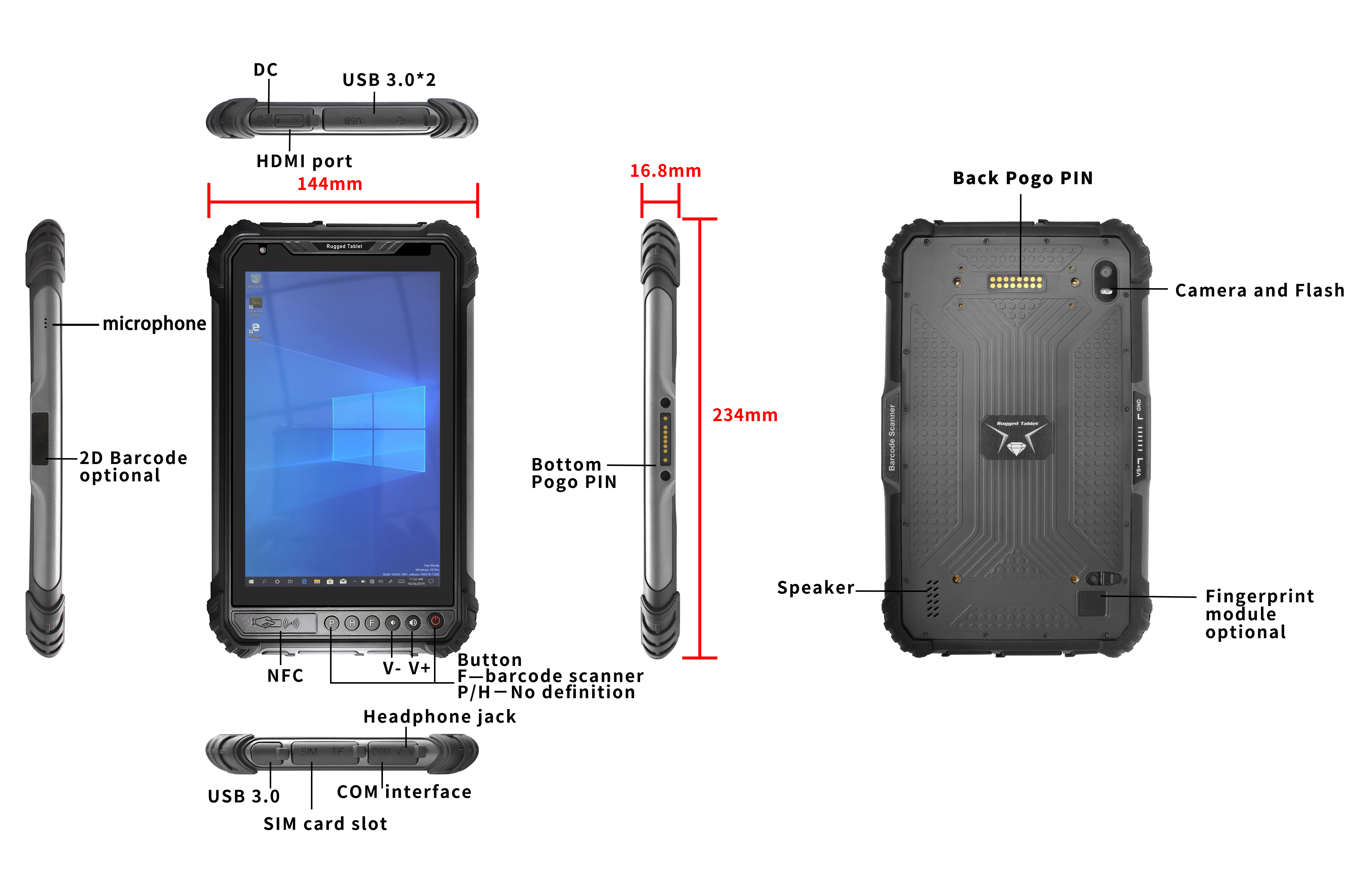 HDMI×1, Slot pour carte SIM×1, RS232×1 (mini-USB), Jack pour casques×1, Jack d'alimentation CC×1 (4,0×15 mm), USB 3.0 ×3 Pogopin inférieur : USB 2.0 ; Chargement ; RS232 Pogopin arrière : USB 2.0 ; RS232 |