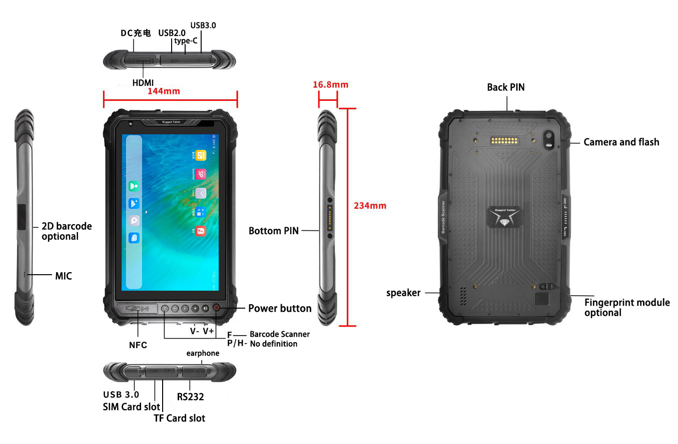 Type-C *1 (OTG/charge rapide), Slot pour carte SIM*1, Slot pour carte TF*1, Jack casque*1, Port DC*1 (4.0*15mm), 1×USB 2.0, 2×USB 3.0, 1×RS232 (mini-USB), 1×HDMI Pins pogopin inférieurs : USB 2.0 ; Chargement ; RS232 Pins pogopin arrière : USB 2.0 ; RS232 |